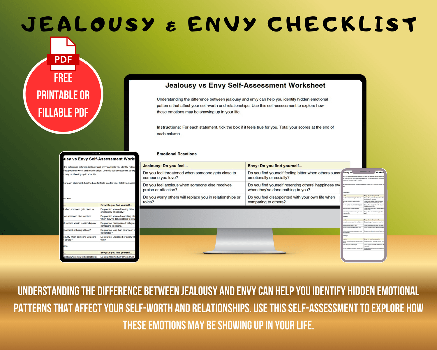 A practical self-assessment that helps you understand the subtle but powerful difference between jealousy and envy. Includes reflective prompts to turn uncomfortable emotions into personal insight and growth.